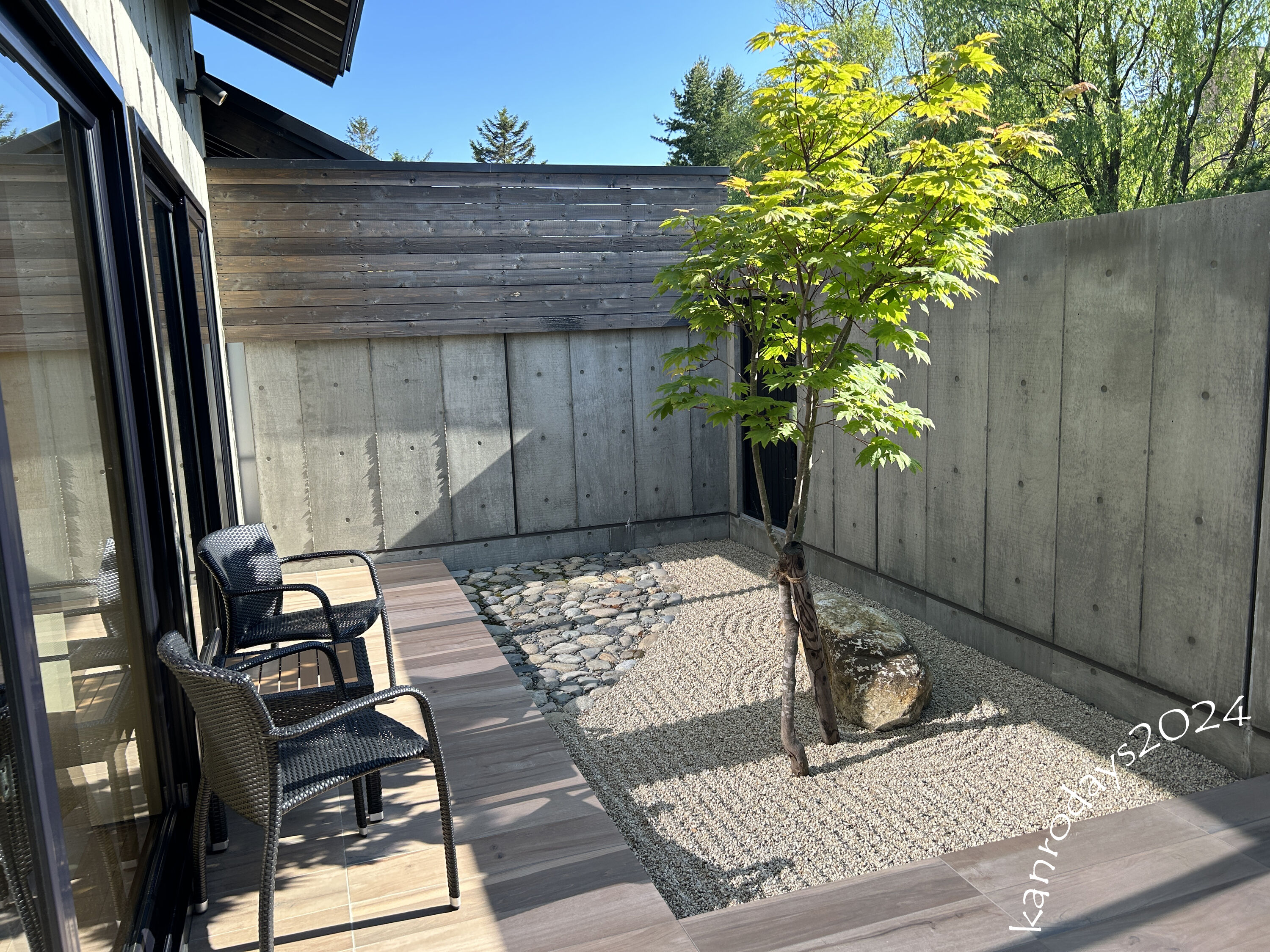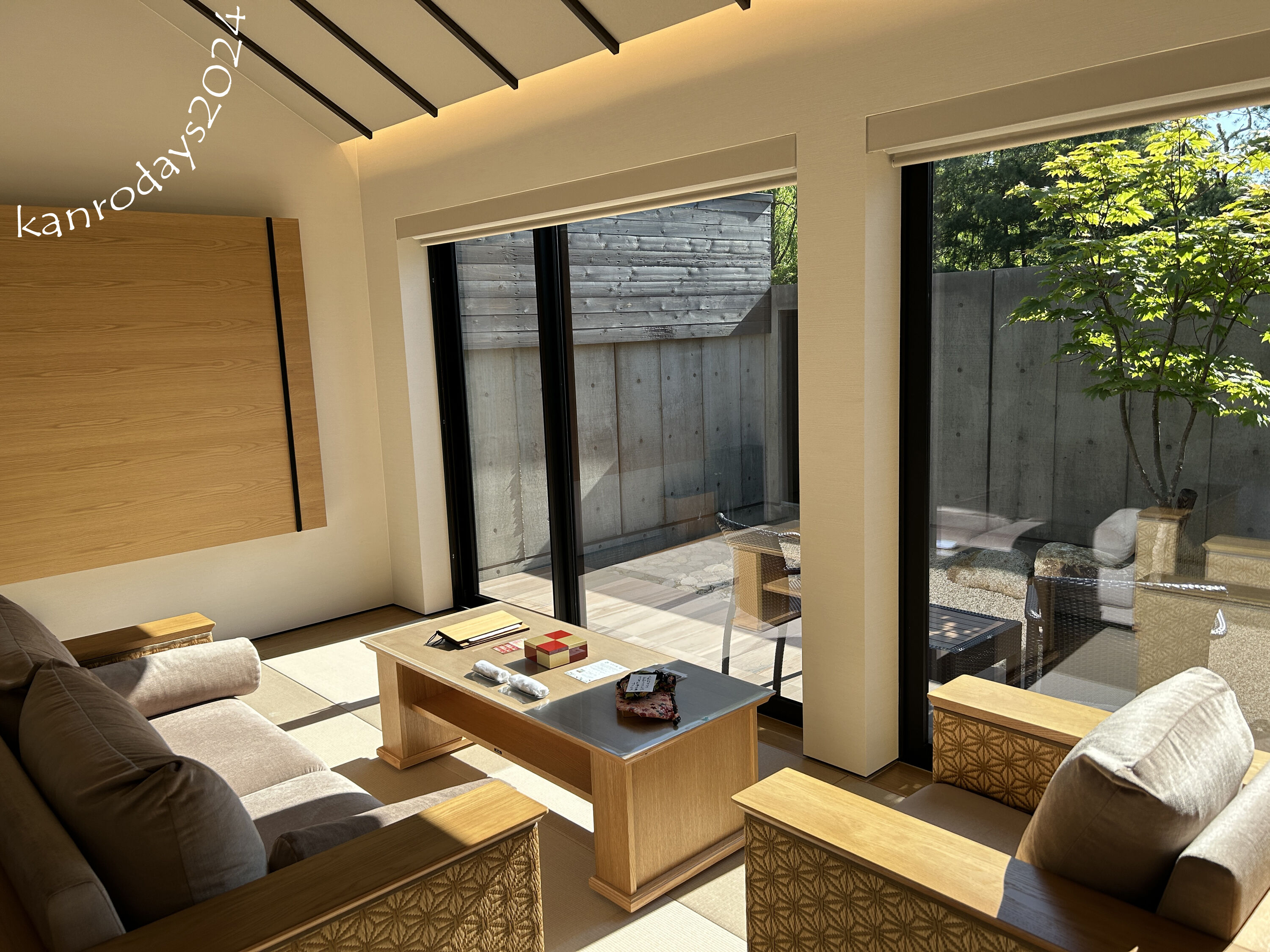 ここ、ガラス張りで中庭に面したテーブル席と
